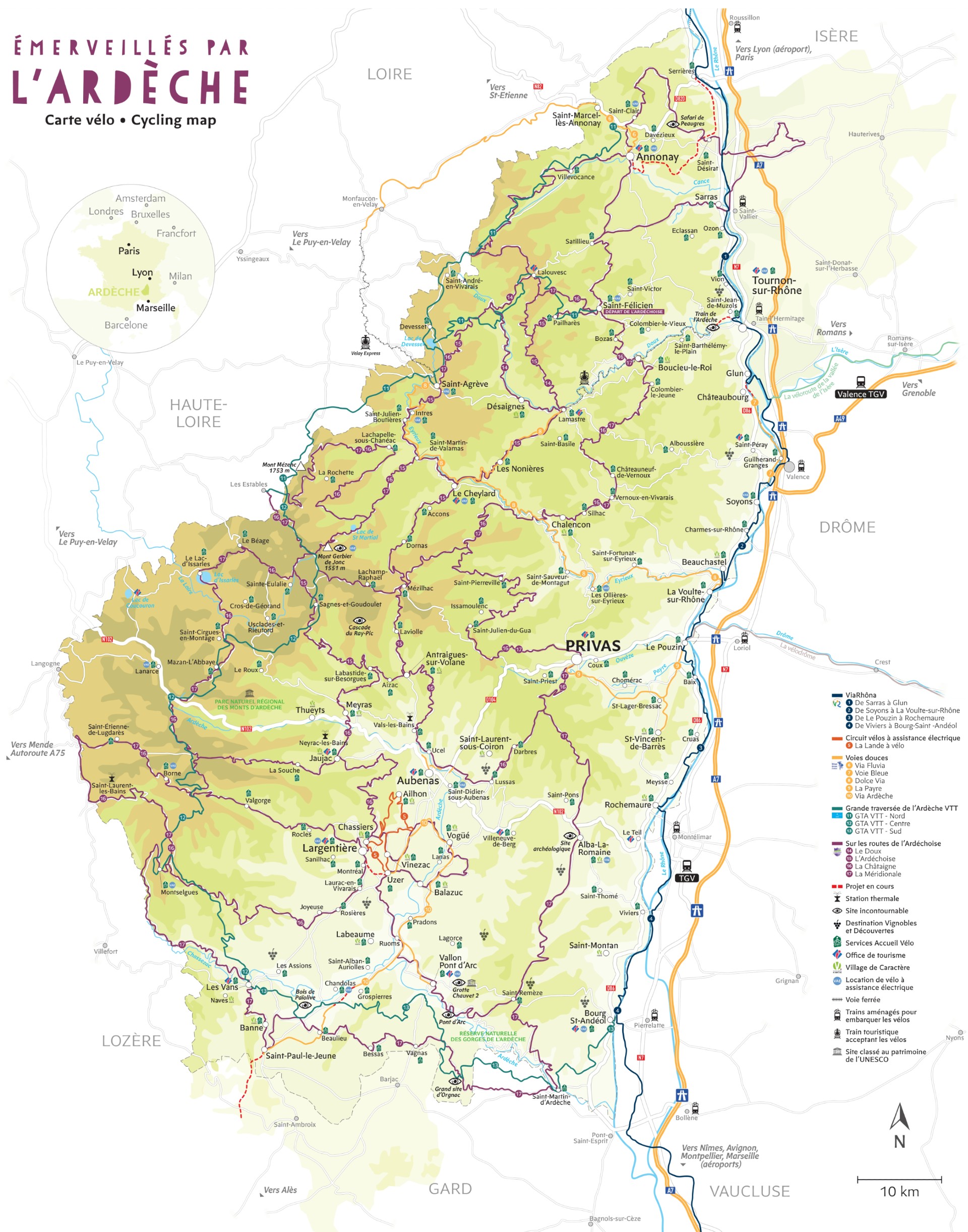 Zoom sur les voies vertes, circuits vélos et sentiers VTT du département ardéchois en région Auvergne-Rhône-Alpes.
