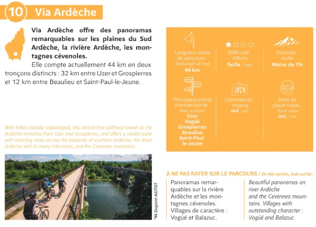 Vélo de route, tout chemin, trekking ou VTT mais aussi pour la marche et d’autres moyens de locomotion douce (roller, trottinette…), les itinéraires cyclables en Ardèche évoluent vers plus de mobilité, tout en douceur.